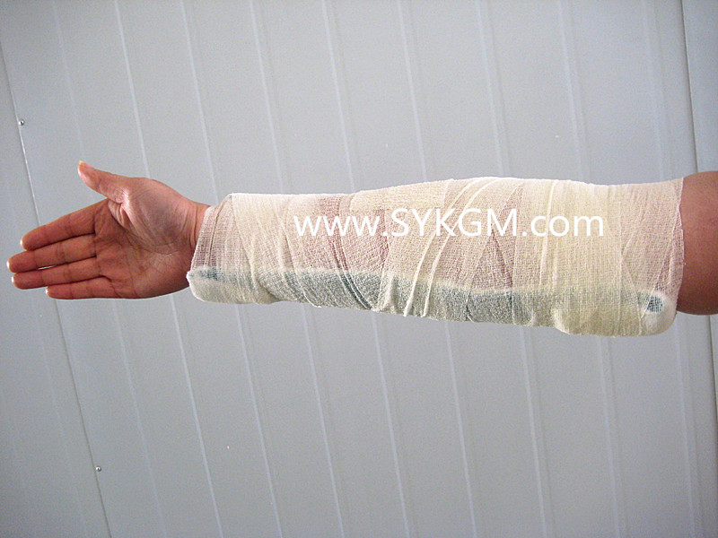 9.需外固定操作时间更长时,夹板可先不淋水,直接进行固定,用纱布绷带或弹性绷带缠绕固定后,可向外层喷洒水来加速硬化速度。
