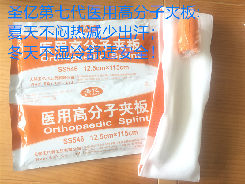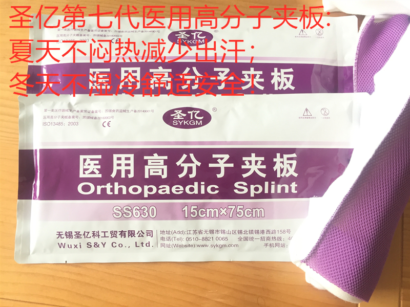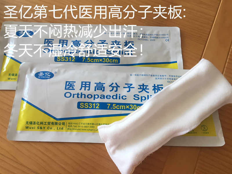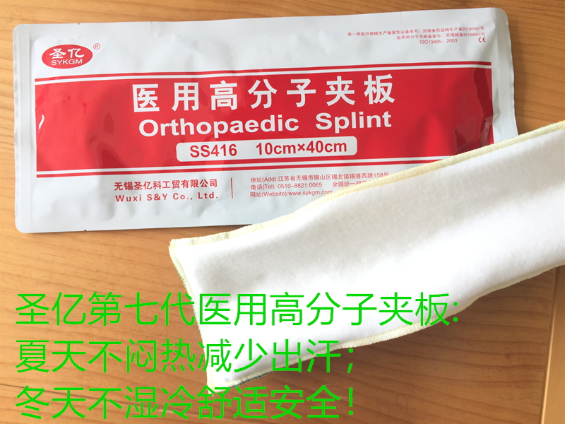 圣亿第七代医用高分子夹板,形式新颖,使用方便,免除了隐患。避免了像其他夹板的漏胶渗入无纺布衬垫、固化后凝成胶刺,会扎伤患者的事故发生。